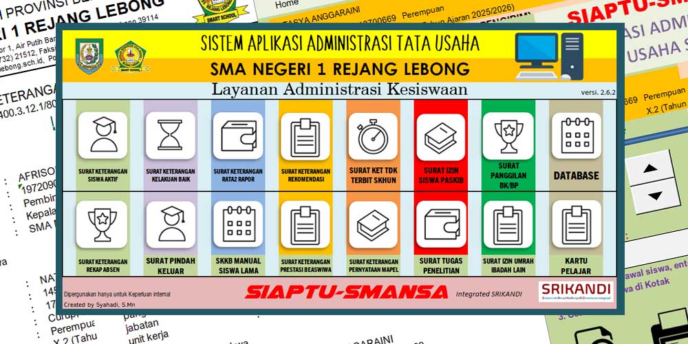SMANSA News – Dalam rangka Meningkatkan kualitas layanan administrasi sekolah yang efisien, cepat, transparan, dan terintegrasi berbasis digital, Tata Usaha SMA Negeri 1 Rejang Lebong telah menggunakan Aplikasi SIAPTU-SMANSA sejak tahun 2023.