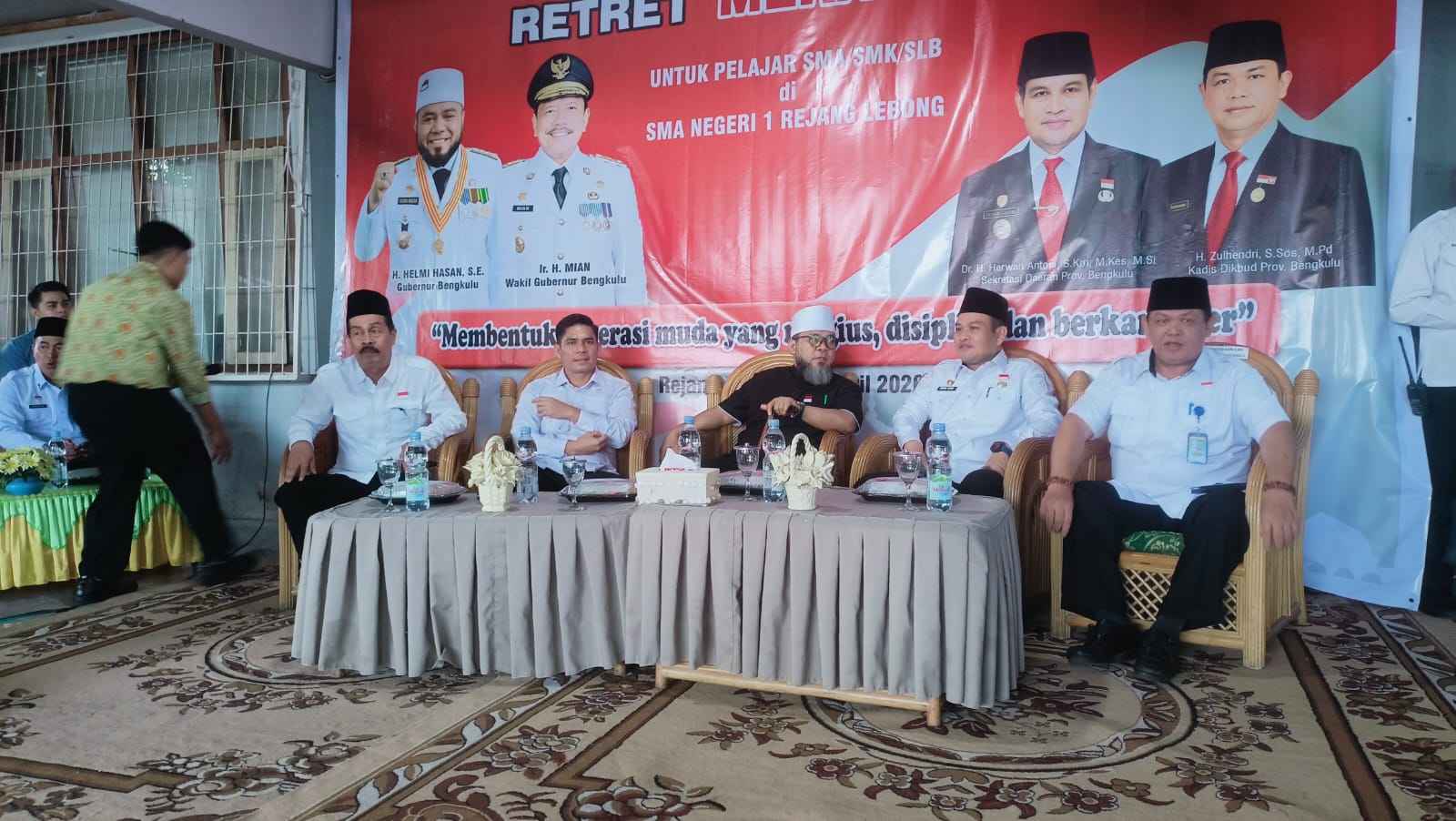 Gubernur Bengkulu hadir didampingi Sekda Provinsi Bengkulu, Plt. Bupati Rejang Lebong, Kepala Dinas Pendidikan dan Kebudayaan Prov. Bengkulu, Kadis PUPR Prov. Bengkulu, Kepala Dinas Kelautan dan Perikanan Provinsi Bengkulu sekaligus Kepala Retreat Merah Putih Provinsi Bengkulu, Kacabdin Pendidikan Wiayah II Curup, Sekda Kabupaten Rejang Lebong, Kepala Dinas Dikbud Kab. Rejang Lebong, Kepala SMA/SMK/SLB se- Rejang Lebong, Guru-guru dan staf tata usaha.
